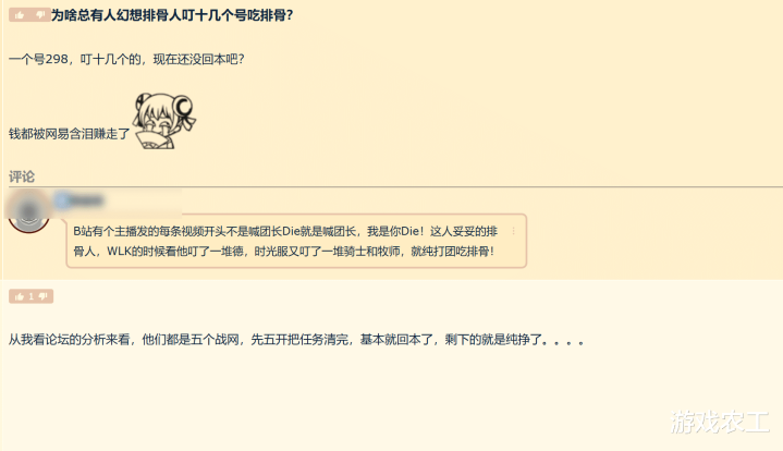 我们先说第一个问题,排骨人会不会叮那么多号?其实农工不清楚帖主从什么角度获取到的消息,说魔兽世界时光服中的排骨人叮了十几个号吃排骨,本身就是不切实际的东西。很多排骨人虽说有多个角色,但是能达到十几个角色的排骨人,在魔兽世界时光服中的数量应该不多。大部分排骨人估计账号数量不会很多,五六个账号是属于比较正常的情况。