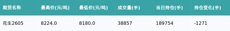 南财智讯3月19日电,盘后期货数据显示,郑州商品交易所的花生主力合约收跌0.15%,收盘报8188.0元/吨,日内资金流出487.79万元。其他相关指标见下表: